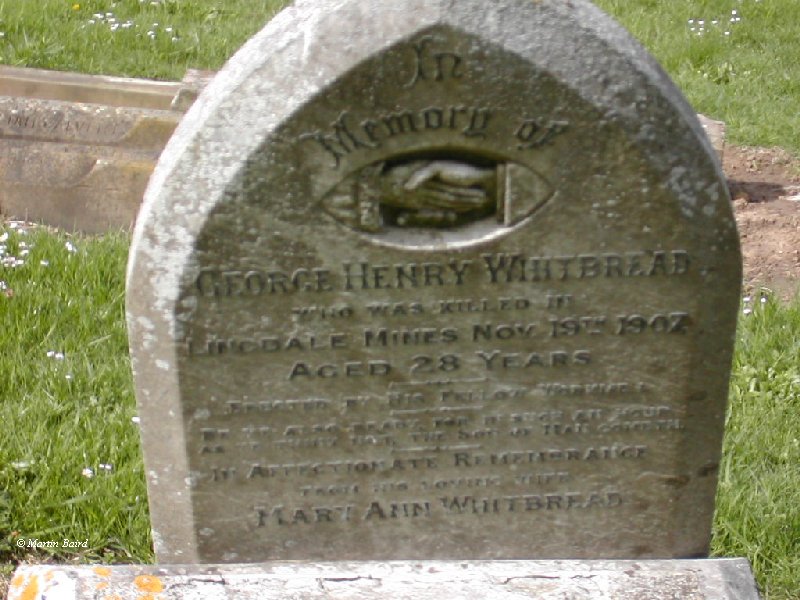 In the graveyard at St. Aidan's I found this gravestone which reads "In memory of George Henry Whitbread who was killed at Lingdale Mines Nov 19th 1907 aged 28. Erected by his fellow workmen.