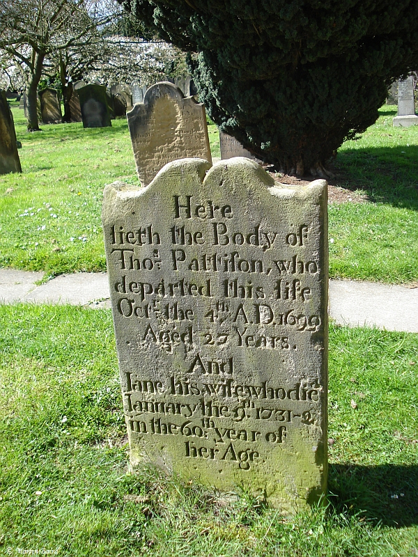 Here lieth the Body of Thos. Pattifon who departed this life Octr the 4th AD 1699 aged 27 Years And Jane his wife who died January the 9th 1731-2 in the 60th year of her age |