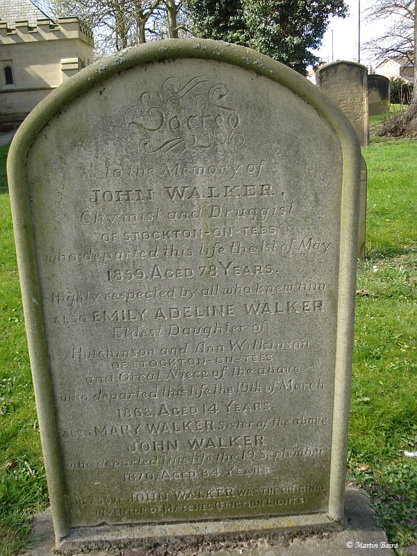 John Walker's gravestone reads Sacred to the memory of John Walker, chemist and druggist who departed this life 1st of May 1859 aged 78 years Highly respected by all who knew him.