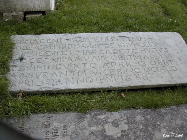 A Parry gravestone dated 1658. Note the clarity of the inscription although almost 400years old. One of a number of Parry and Love Parry stones in the graveyard.